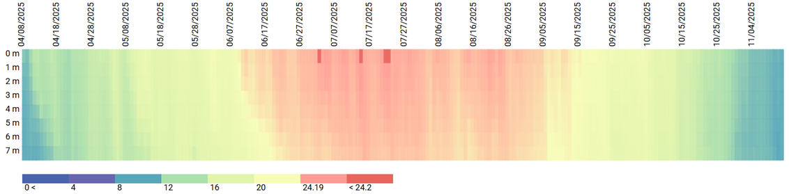 Daily Temperature Profile (˚C) on monitoring buoy, Cherry Creek Reservoir, WY 2024