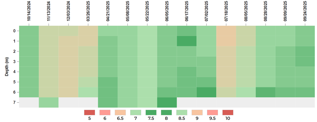 pH Depth Profile from CCR-2, Cherry Creek Reservoir, WY 2025 (click the image for larger graph).